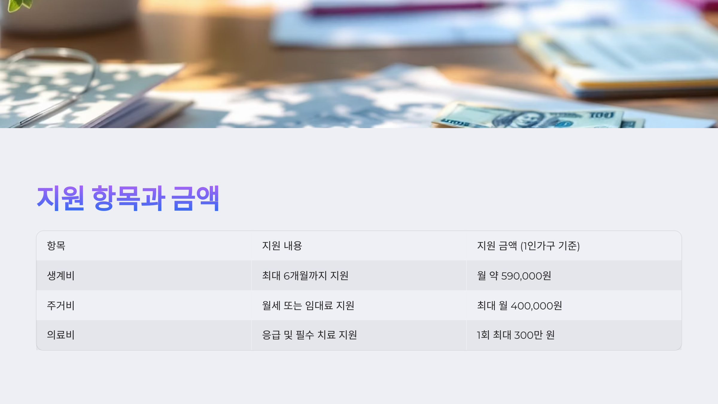 | 생계비 | 최대 6개월까지 지원 | 월 약 590,000원 |