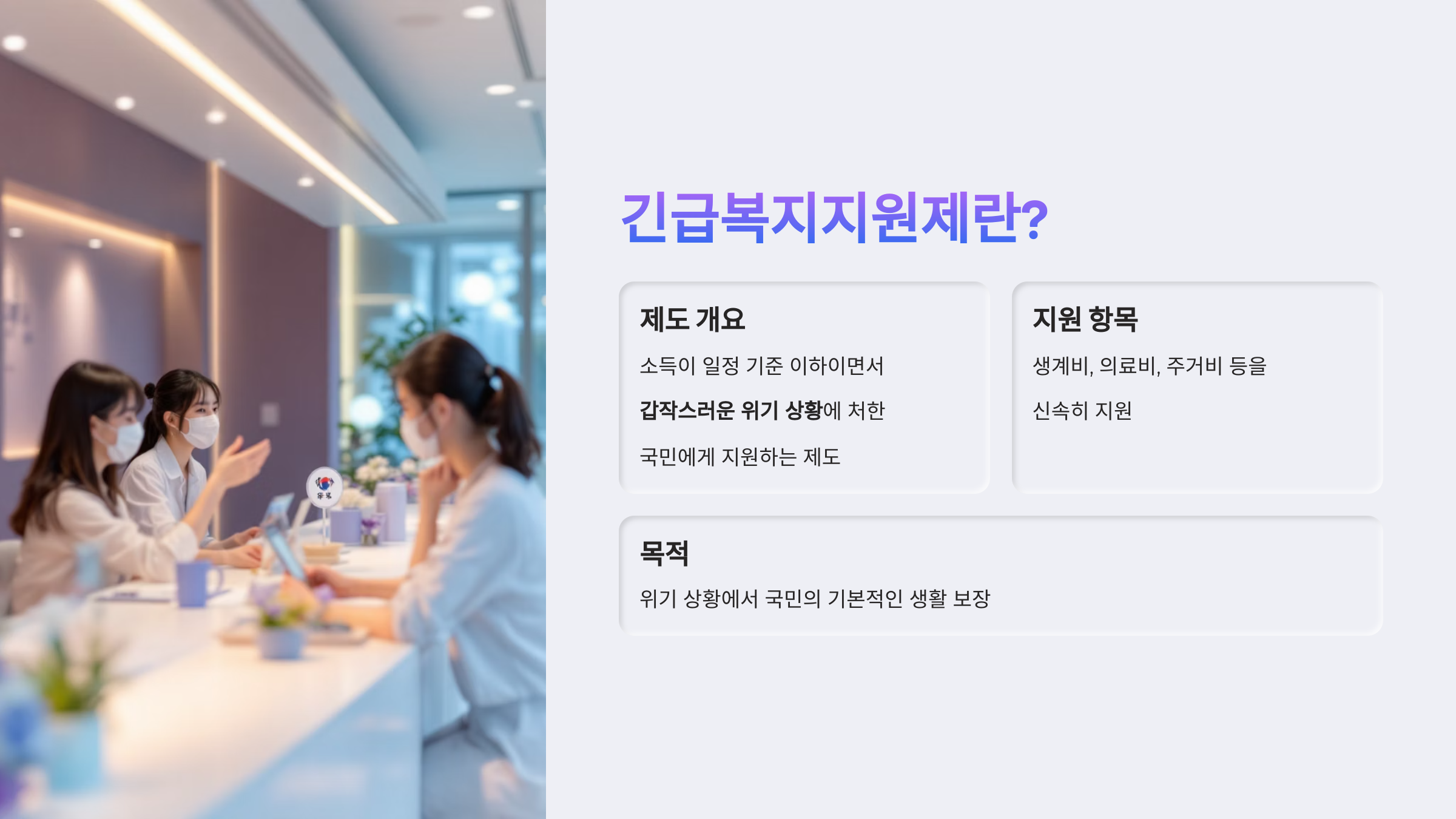 소득이 일정 기준 이하이면서 갑작스러운 위기 상황에 처한 국민에게 생계비, 의료비, 주거비 등을 신속히 지원하는 제도입니다.
