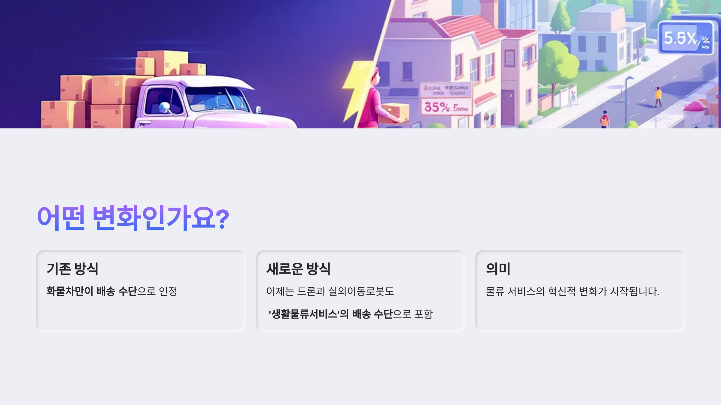 기존에는 화물차만이 배송 수단으로 인정되었지만, 이제는 드론과 실외이동로봇도 ‘생활물류서비스’의 배송 수단으로 포함됩니다.