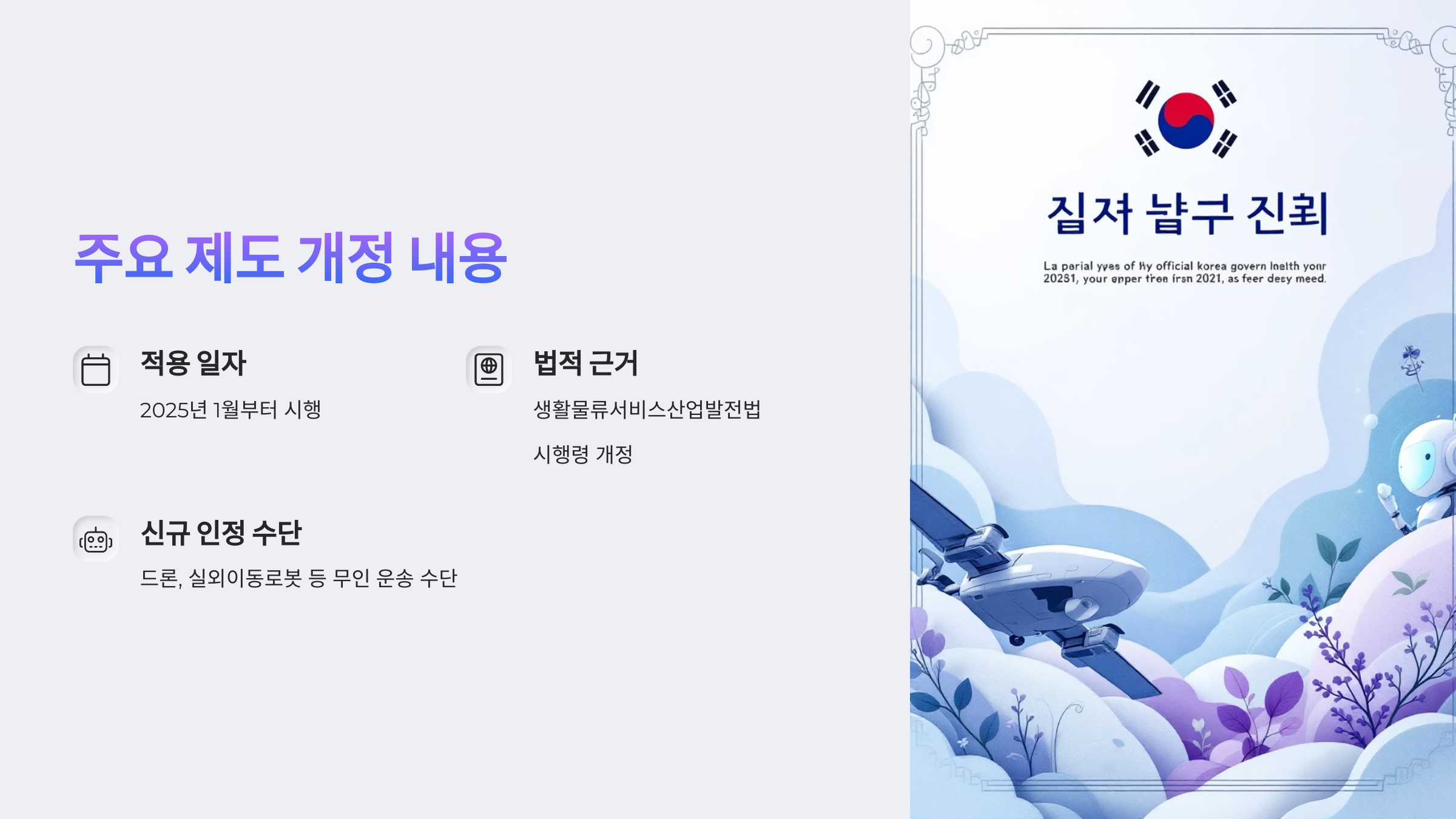 2025년 생활물류법 시행령 개정으로 드론·실외이동로봇을 통한 배송 서비스가 가능해졌습니다.