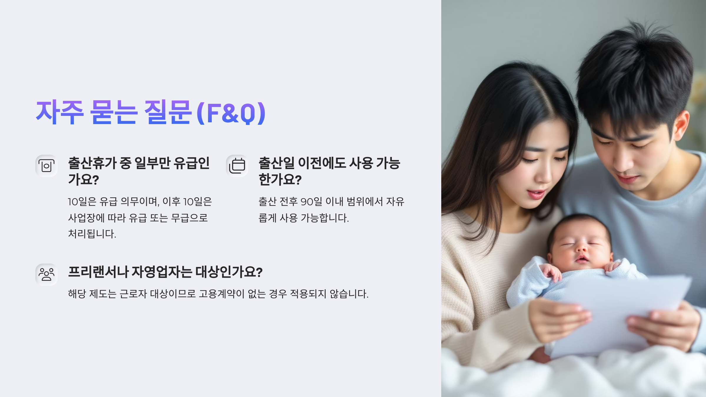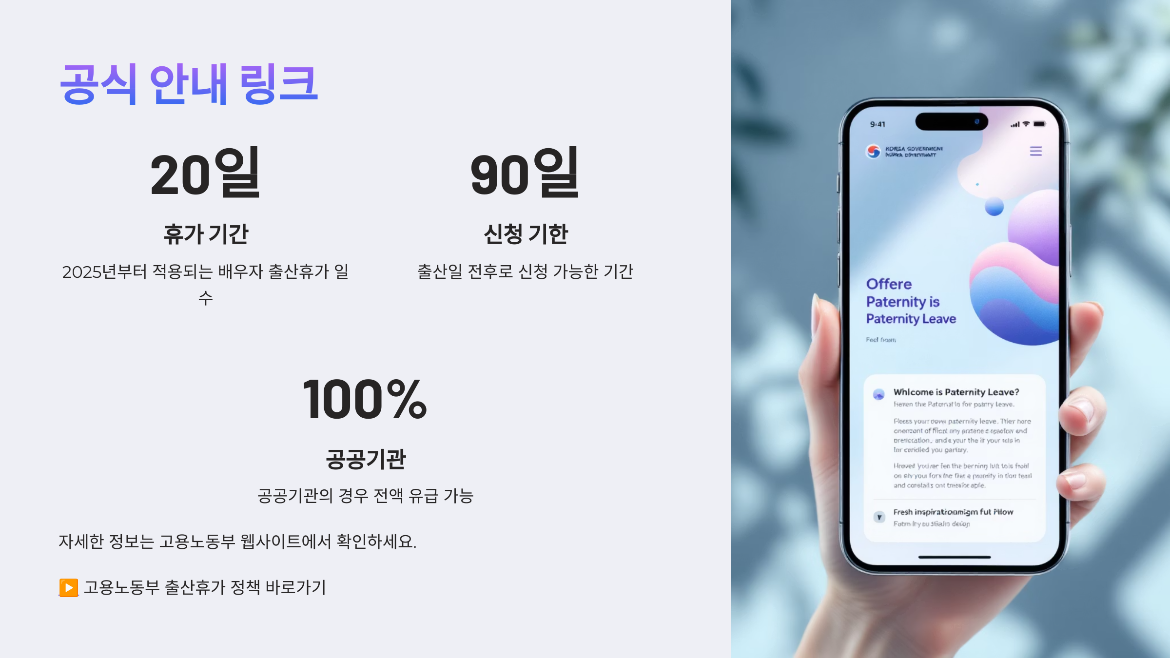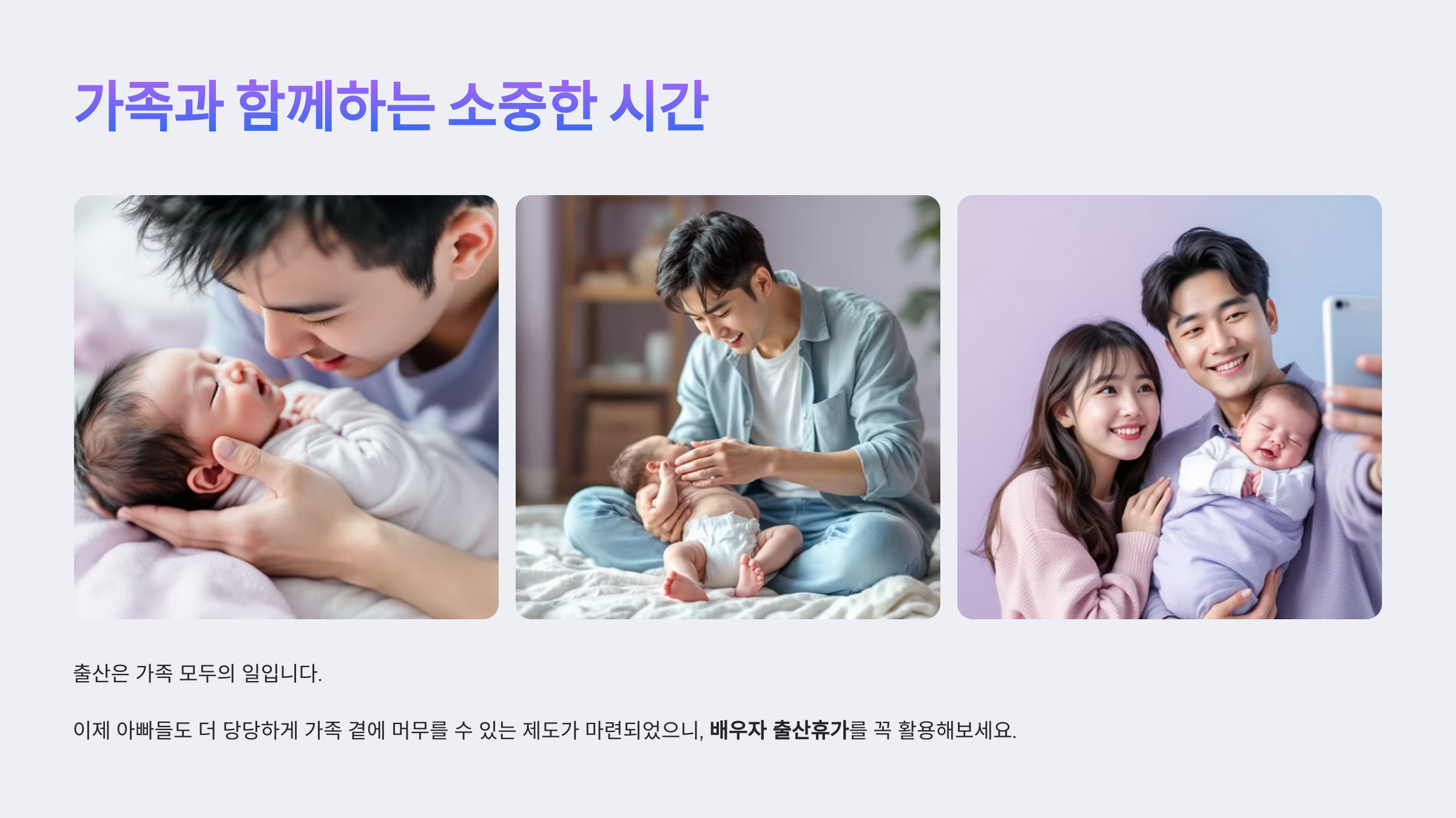 이제 아빠들도 더 당당하게 가족 곁에 머무를 수 있는 제도가 마련되었으니, 배우자 출산휴가를 꼭 활용해보세요.