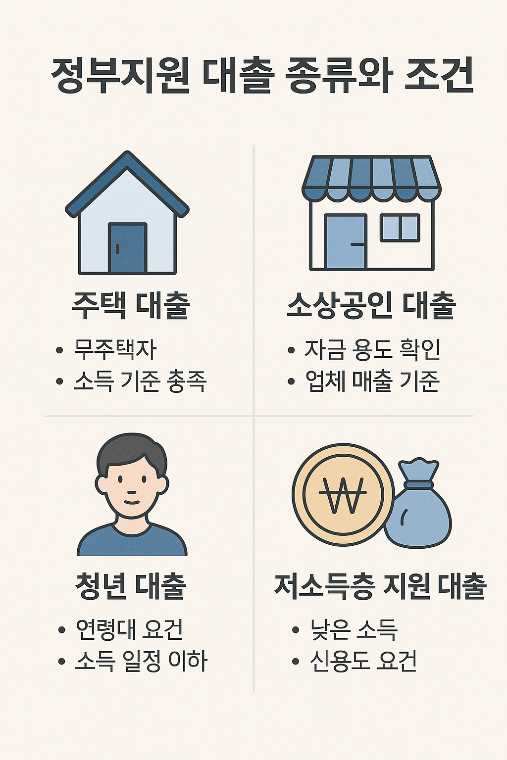 정부지원대출은 단기적인 어려움을 극복하고, 더 나아가 신용 회복과 자립을 도울 수 있는 유용한 수단입니다. 내가 어떤 조건에 해당하는지 확인하고, 적절한 상품을 선택하여 안정적인 금융생활을 시작해 보세요. 특히 청년, 저소득층, 자영업자 등은 해당 상품을 적극적으로 활용하면 경제적 부담을 크게 줄일 수 있습니다.