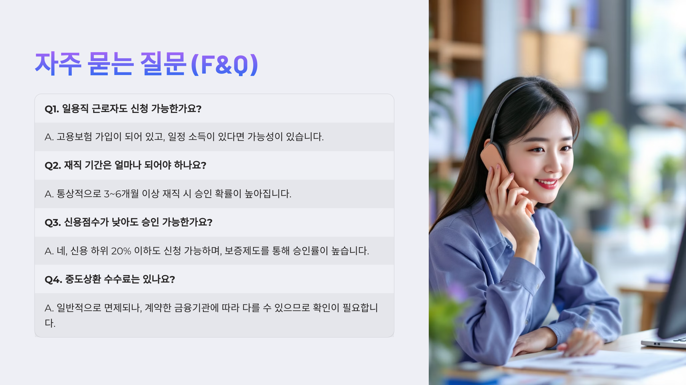 - A. 통상적으로 3~6개월 이상 재직 시 승인 확률이 높아집니다.